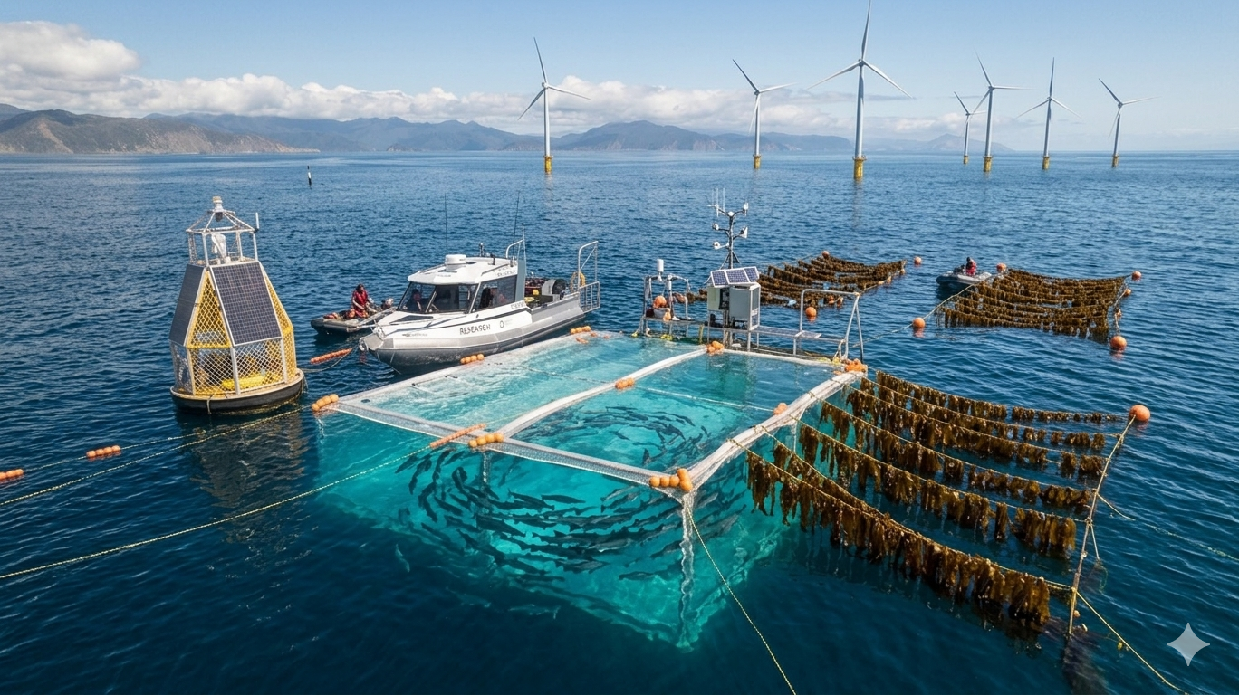 An entirely imaginary Blue Economy Zone including integrated multi-trophic aquaculture and offshore wind. Imagery of an adapted version of the Plant and Food Research Mobile Aquaculture Production System used with permission. Gemini AI generated. 17.04.26.
